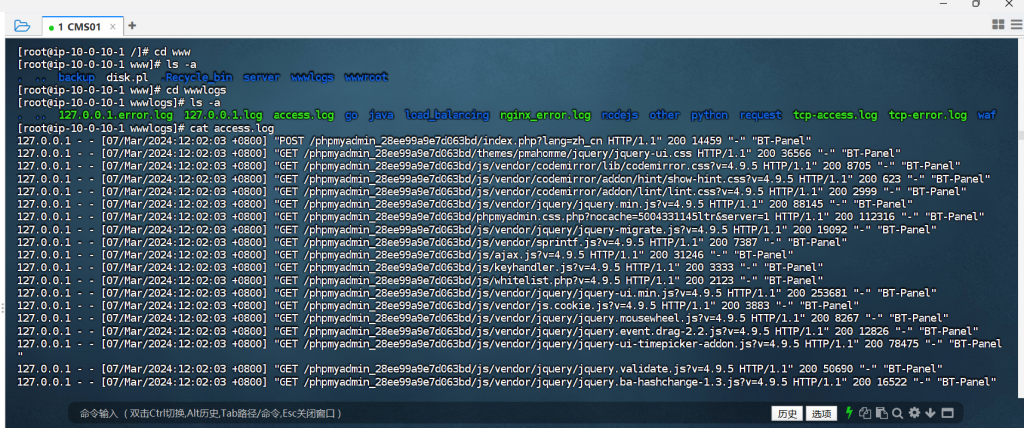 我们通过查看监听端口找到了mysql数据库的程序启动并且也启动了nginx服务,那在进入他的log目录下进行查看