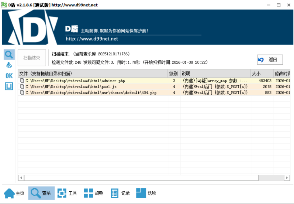 这个时候既然知道是黑链,那也就是web服务器下的一些文件,直接将html文件丢到d盾里进行查杀会得到三个提示我们跟着路径一个一个找就行